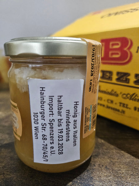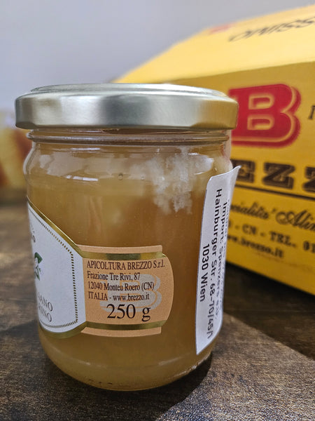 Miel de mandarine fruité et pur (Miele di Mandarino) issu de l'apiculture familiale Brezzo. L'apiculture est présente dans le Piémont et migre avec les abeilles vers le sud, vers les agrumes. La pollinisation des fleurs par les abeilles est nécessaire pour obtenir des fruits de haute qualité et une bonne récolte.