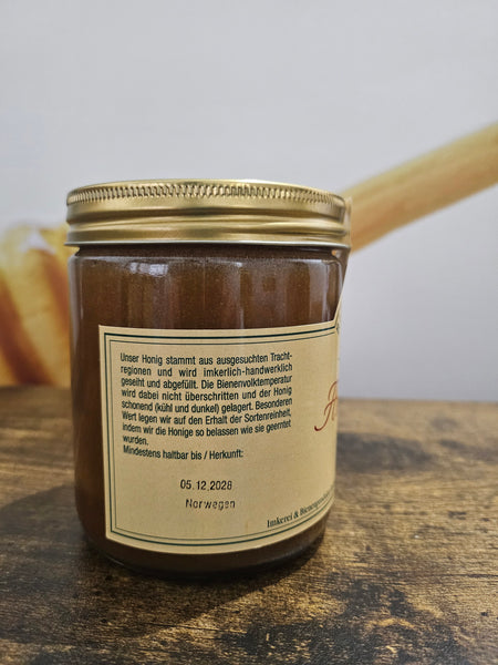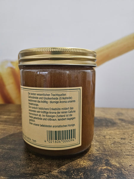 Aromatischer, rötlicher Heidehonig. Die Heidelandschaft ist eine alte Kulturlandschaft in der Bienen hauptsächlich Nektar von Heidekraut (sog. Besenheide) und Erikablüten (sog. Glockenheide) sammeln. Der Heidehonig ist dunkel mit rötlichem Ton und mit geleeartiger Konsistenz. Beim Auskristallisieren verändert sich die Farbe in einen helleren Farbton. Dieser Honig zählt zu den kräftigsten Honigen überhaupt und wer einmal Heidehonig probiert hat, der wird immer wieder darauf zurück kommen. Die Herkunftsländer sind meistens Frankreich und Norwegen, eher selten Schottland oder Deutschland.